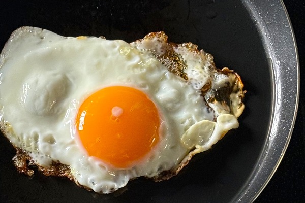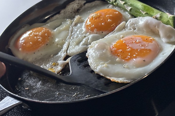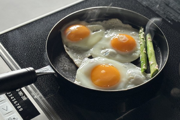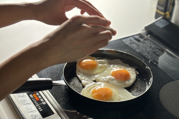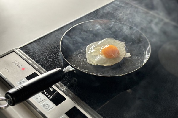 卵が美味しく焼ける温度は、メイラード反応が起こる160~180 度と言われています。メイラード反応とは、タンパク質と糖を加熱することで、きつね色になる反応で、これが香ばしい風味を醸し出します。高温を維持しながら焼くことがポイントで、保温性の高い鉄フライパンだからこそ、目玉焼きがより美味しく焼くことができます。