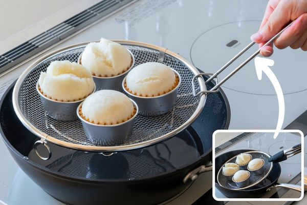 取っ手のない盆ざるはフライパンや鍋に入れやすく、蒸し料理にも最適。