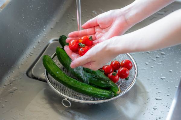 ボウル型のざると比べ、ほぼ平らで食材が重なりにくく、水切れが早いのが魅力。