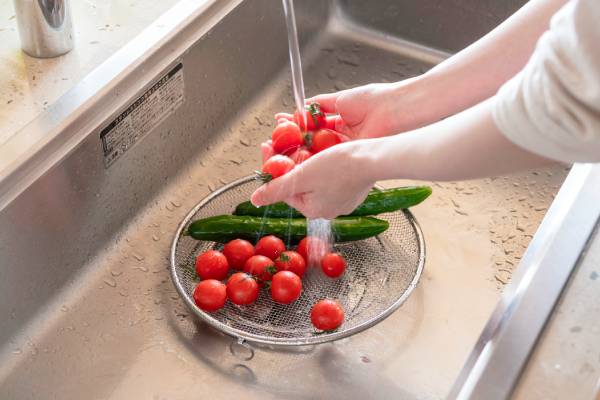 ボウル型のざると比べ、ほぼ平らで食材が重なりにくく、水切れが早いのが魅力。